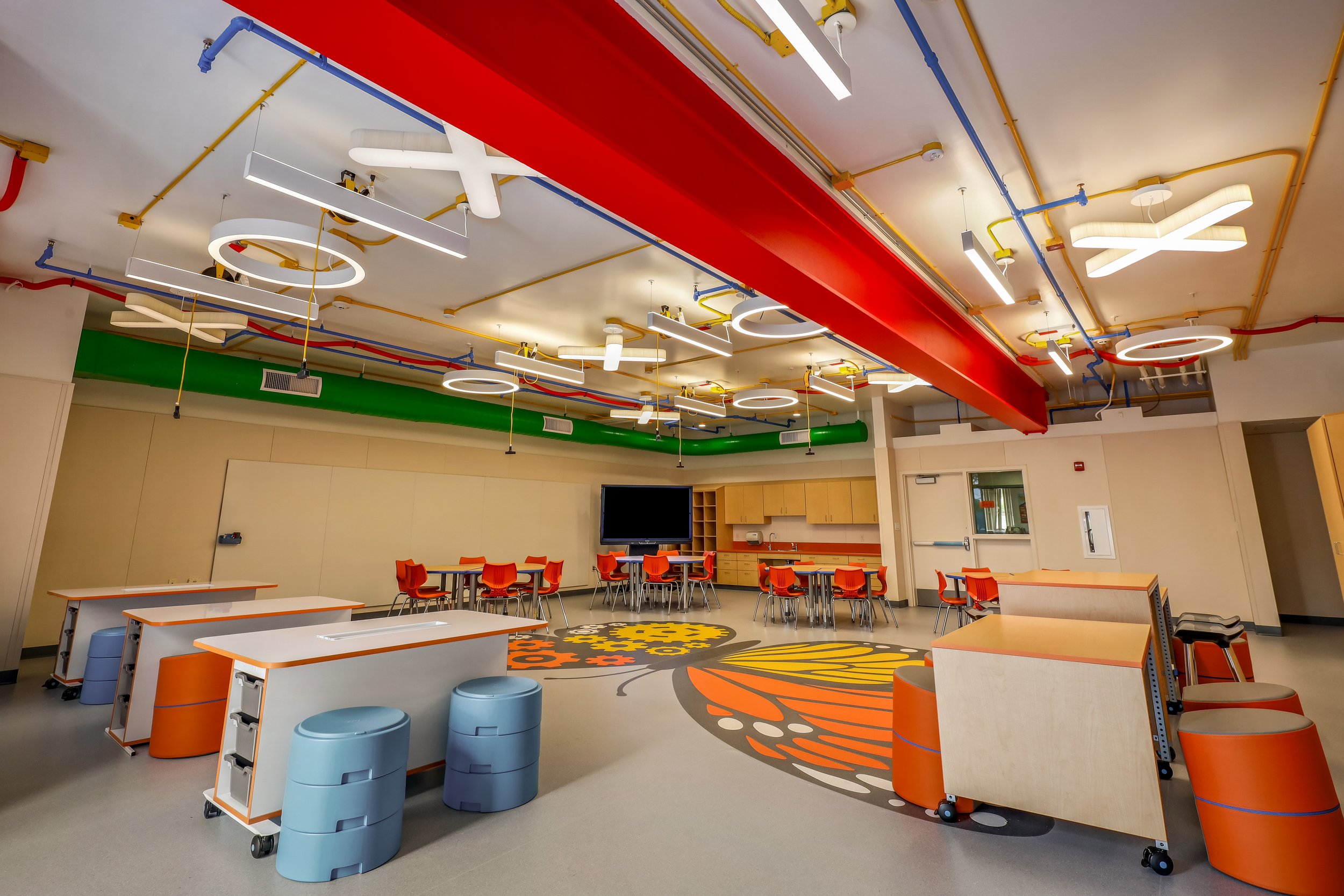 Two standard classrooms at this elementary school was transformed into a playful new maker space that sparks curiosity and active learning. While using vibrant colors reminiscent of Lego blocks, the design draws on creating teaching moments throughout the space.